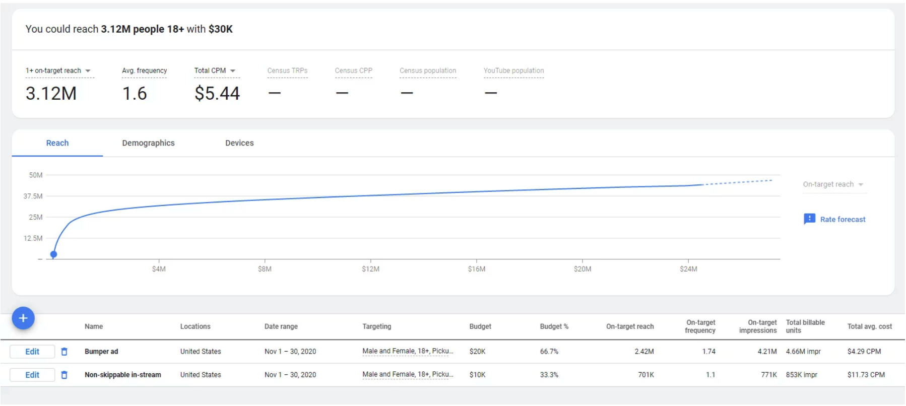 Google Ads Reach Planner example output >>